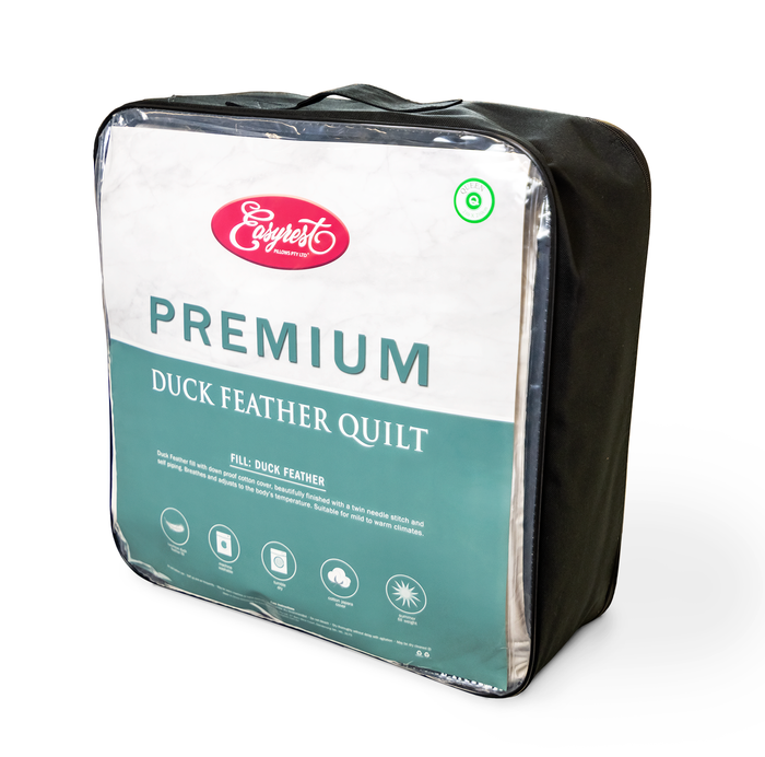 The Duck feather quilt is filled with 100% premium white duck feathers. Cotton japara down proof cover. Beautifully finished with twin needle stitch and self-piped edges. Boxed wall construction for even distribution. Breathes and adjusts to the body’s temperature. Suitable for warm to mild climates. Available in single, double, queen and king sizes.