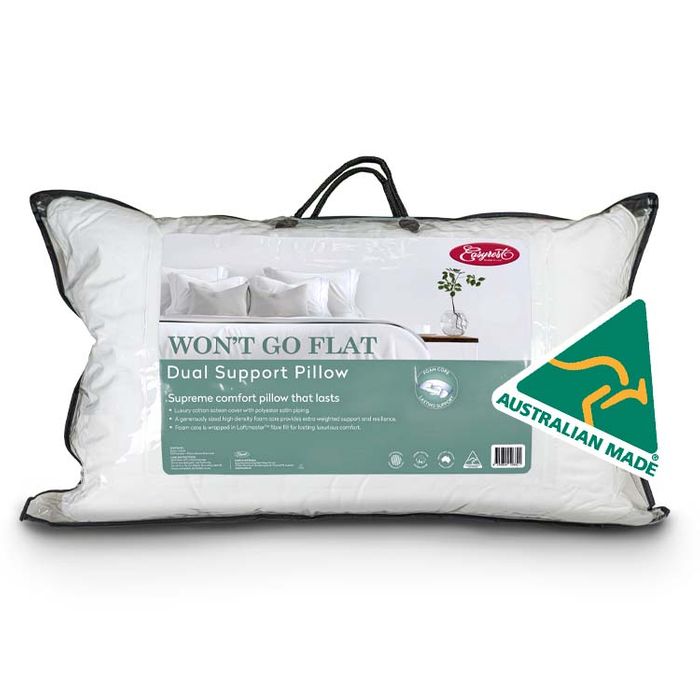 A supreme comfort, dual support pillow that lasts. The Australian Made Won't Go Flat Pillow has a generously sized, high density foam core which provides extra weighted support and resilience. The foam core is wrapped in LoftMaster™ fibre fill for long lasting and luxurious comfort.